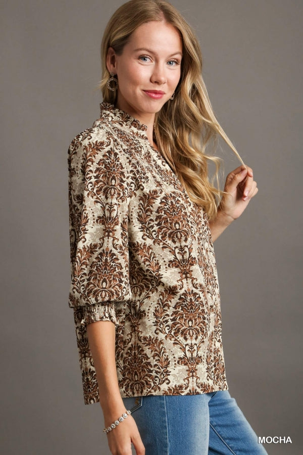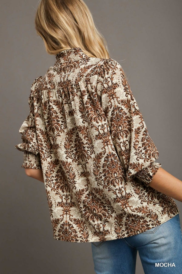 Ruffle neck, smocked print blouse with 3/4 sleeves. Button closure with elastic at the cuffs.