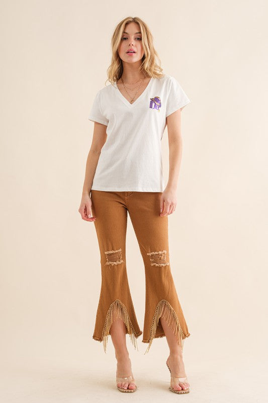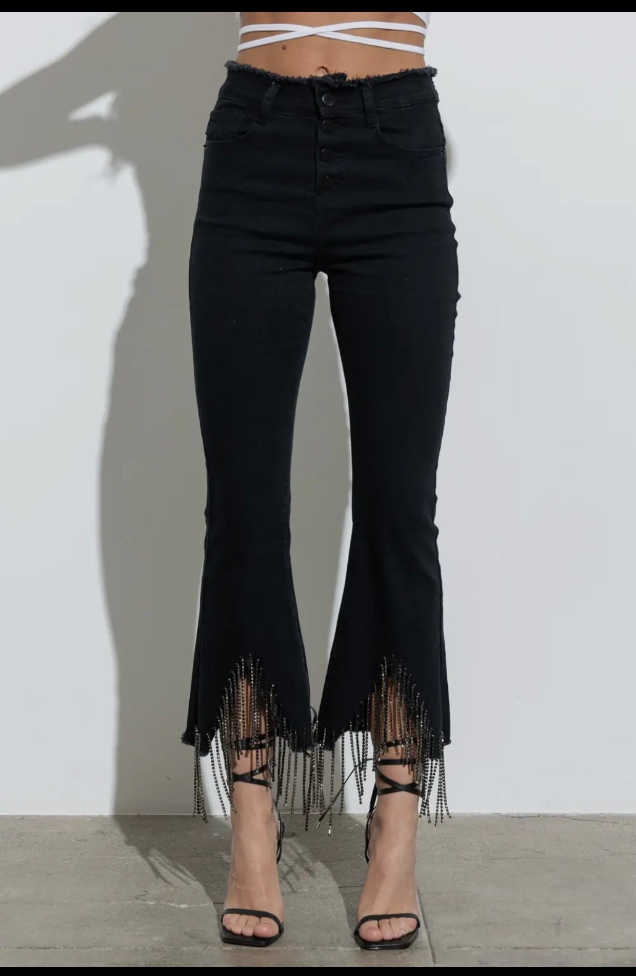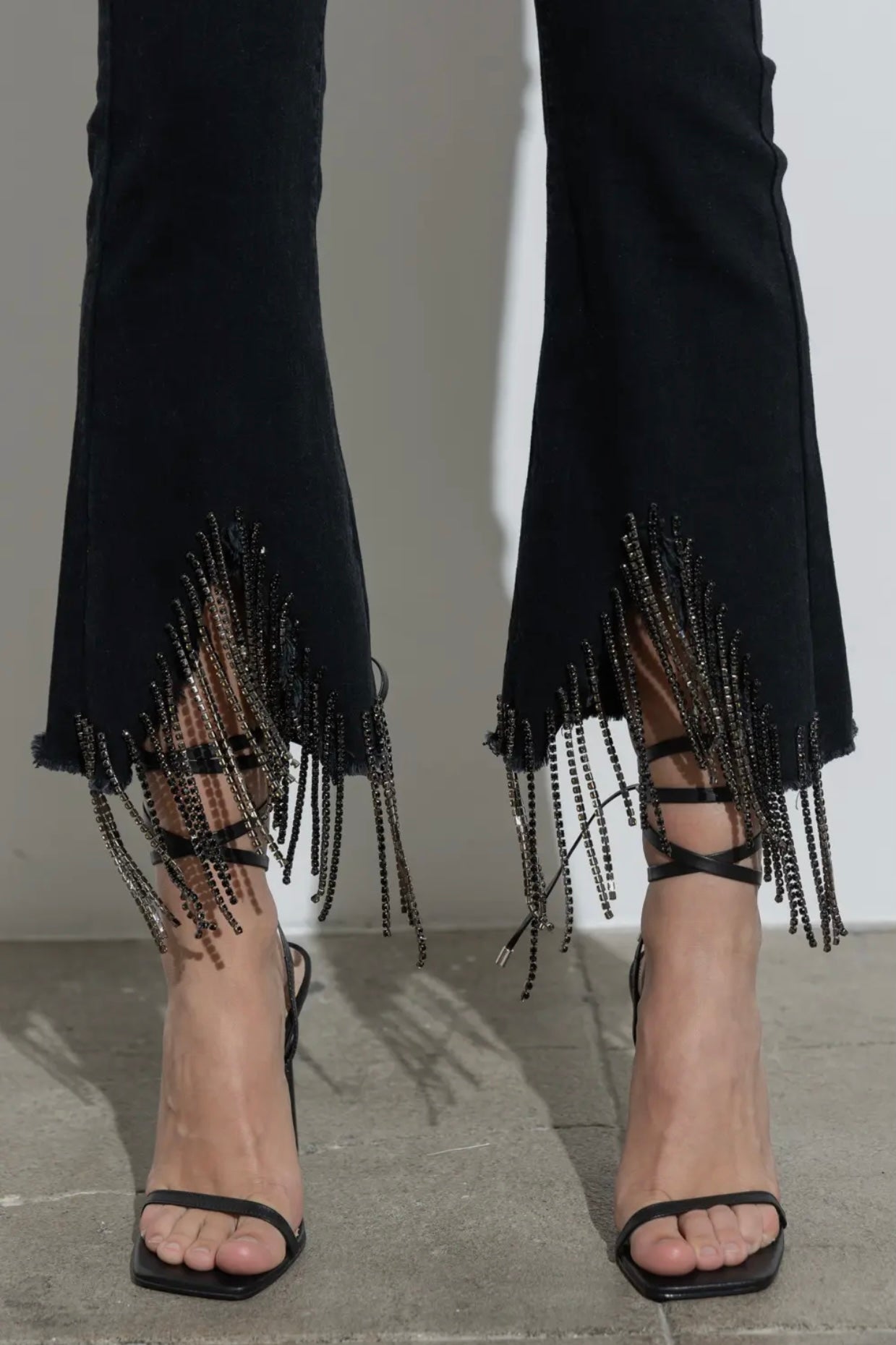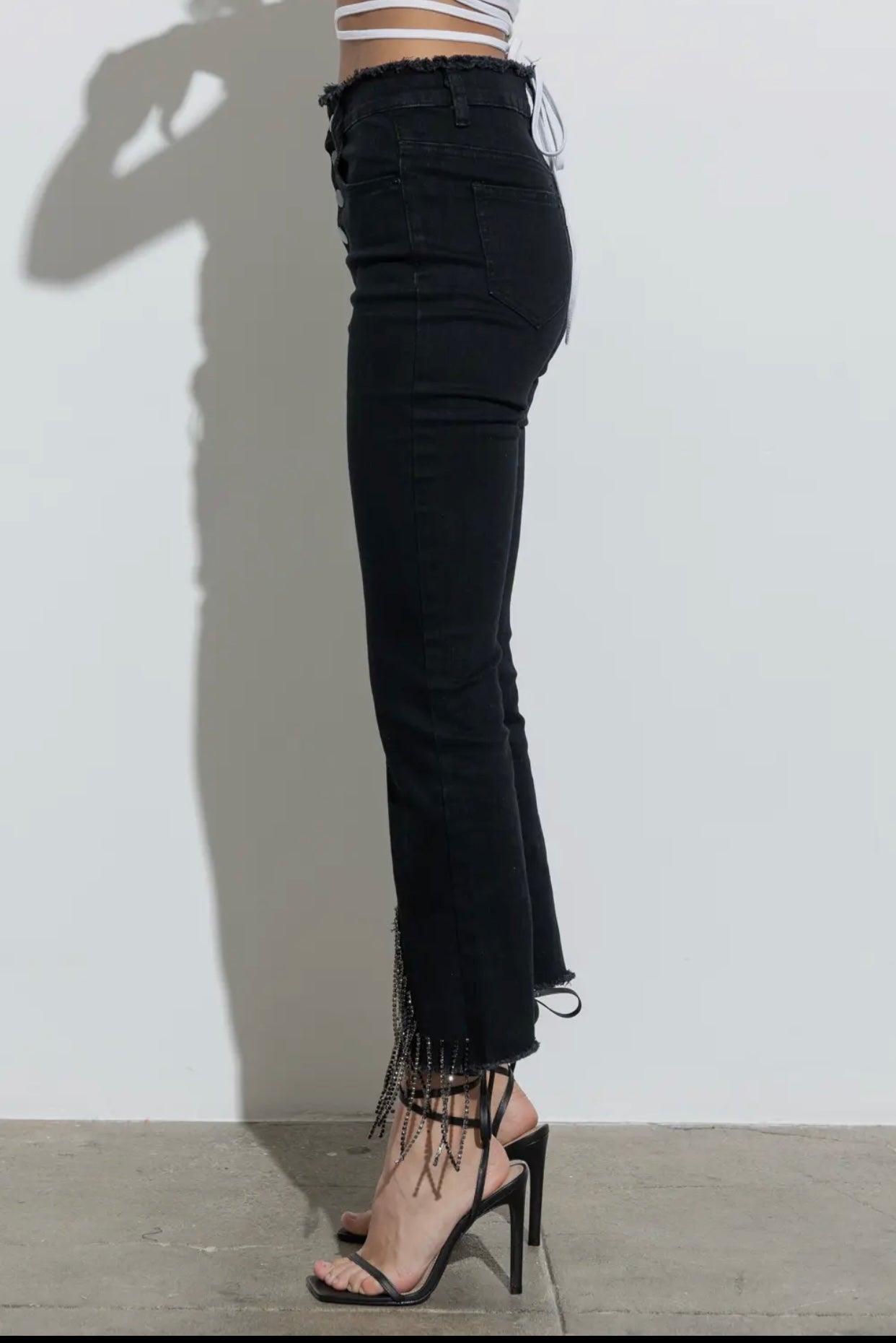 Denim capri with sequin detail. Very good stretch for a comfortable fit.